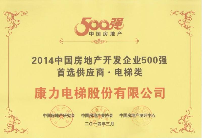 奖项名称: 2014中国房地产开发企业500强首选供应商 颁发机构: 中国房地产业协会 2014年03月26日 奖项说明: 2014中国房地产开发企业500强首选供应商,电梯类第8名,品牌首选率2%