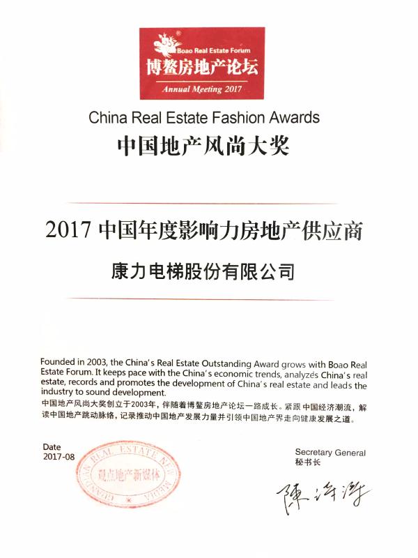 第十七届博鳌房地产论坛上,康力电梯荣获“2017中国年度影响力房地产供应商”。
