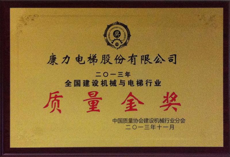全国建筑机械与电梯行业质量工作会议暨分会第四届四次理事会扩大会议,康力电梯荣获2013年第二届全国建筑机械与电梯行业最高质量奖—质量金奖,此项荣誉每年只授予两家企业。