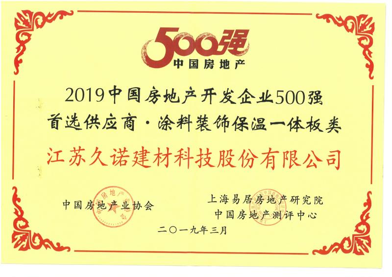 奖项名称: 2019中国500强房地产企业首选保温装饰一体板品牌 颁发机构: 中国房地产业协会、中国房地产测评中心、上海易居房地产研究研究 2019年03月20日 奖项说明: 百强开发商见证工程实力,久诺斩获“2019中国房地产开发企业500强首选供应商品牌” ,久诺蝉联2019中国房地产开发企业500强首选供应商服务商品牌涂料类TOP10