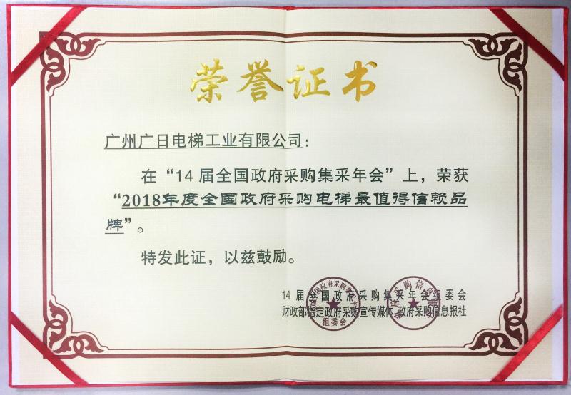 奖项名称: 全国政府采购电梯最值得信赖品牌 颁发机构: 14届全国政府采购集采年会组财政部指定政府采购宣传传媒 2019年01月04日 奖项说明: 本次会议也是围绕政府采购绩效、深化政府采购制度改革、推进政府采购电子化,有关各方进行广泛交流、深入探讨。广日电梯紧随国家政府发展的步伐,积极响应政府需求,为采购单位提供高质量的产品与服务。2018年广日电梯在政府采购中取得辉煌成绩,中标政府招标项目近千台,其中包括政府轨道交通项目、政府行政办公楼、教育基地以及安置房等各类大项目。在市场发展中,广日电梯在技术研发、产品设计环节融入了更多的人文关怀,在安装服务以及售后服务等方面更是以快速的服务响应、及时发货、高质量安装获得政府机关的一致好评,再次荣获此奖可谓实至名归。
