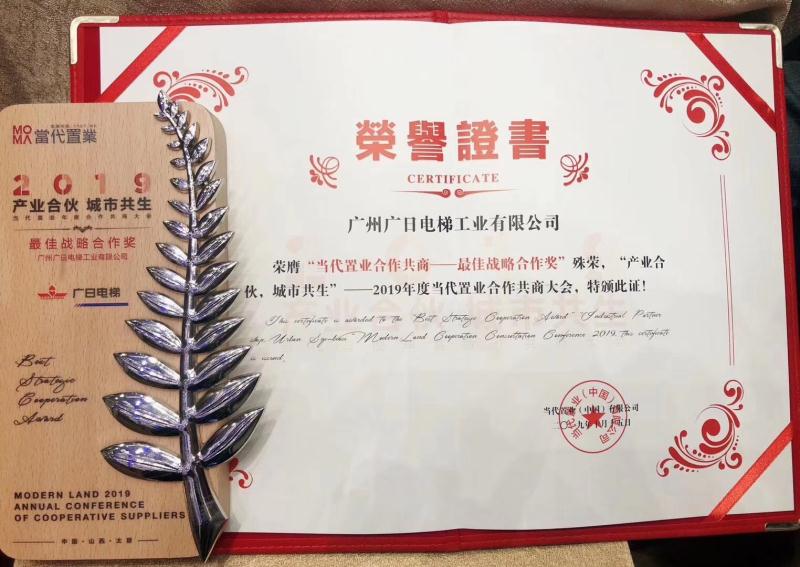 奖项名称: 当代置业合作共商——最佳战略合作奖 颁发机构: 当代置业(中国)有限公司 2019年10月15日 奖项说明: 作为中国领先的绿色科技地产运营商,当代置业始终最大限度的提高建筑的舒适度,满足能源、舒适、环境的协调,为城市美好发展做贡献。而广日电梯作为其多年发展的同路人,与当代的企业使命——“科技建筑、绿色家园、城市向美”不谋而合,依托全新的研发平台、高度智能化的制造体系,专注于智能产品的研发制造,坚持为每一位客户营造安全、舒适、绿色的电梯乘坐体验。