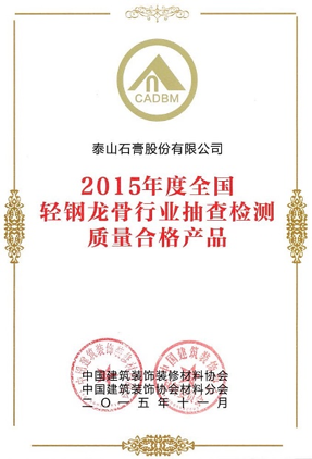 奖项名称: 全国轻钢龙骨行业抽检检测质量合格产品 颁发机构: 中国建筑装饰装修材料总会 2015年11月01日 奖项说明: 全国轻钢龙骨行业抽检检测质量合格产品