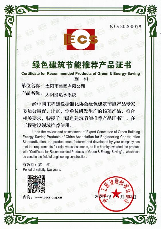 奖项名称: 绿色建筑节能推荐产品 颁发机构: 中国工程建设标准化协会 2020年07月01日 奖项说明: 太阳雨集团有限公司太阳能热水系统获得绿色建筑节能推荐产品证书
