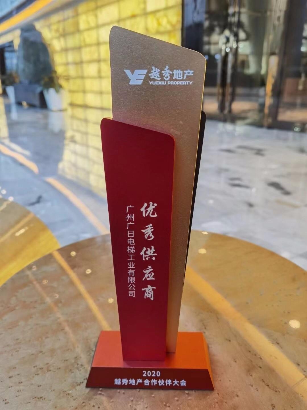奖项名称: 2020年越秀地产优秀供应商 颁发机构: 越秀地产股份有限公司 2020年11月24日 奖项说明: 2020年11月3日,越秀地产合作伙伴大会暨数字招采平台发布会圆满举行。本次大会以“数字招采 美好共赢”为主题,与全国500多位合作伙伴一起展望数字化浪潮下的新征程,携手智赢未来。会议上,广日电梯凭借着卓越的产品品质和优质的服务能力,荣获“2020年越秀地产优秀供应商”称号。