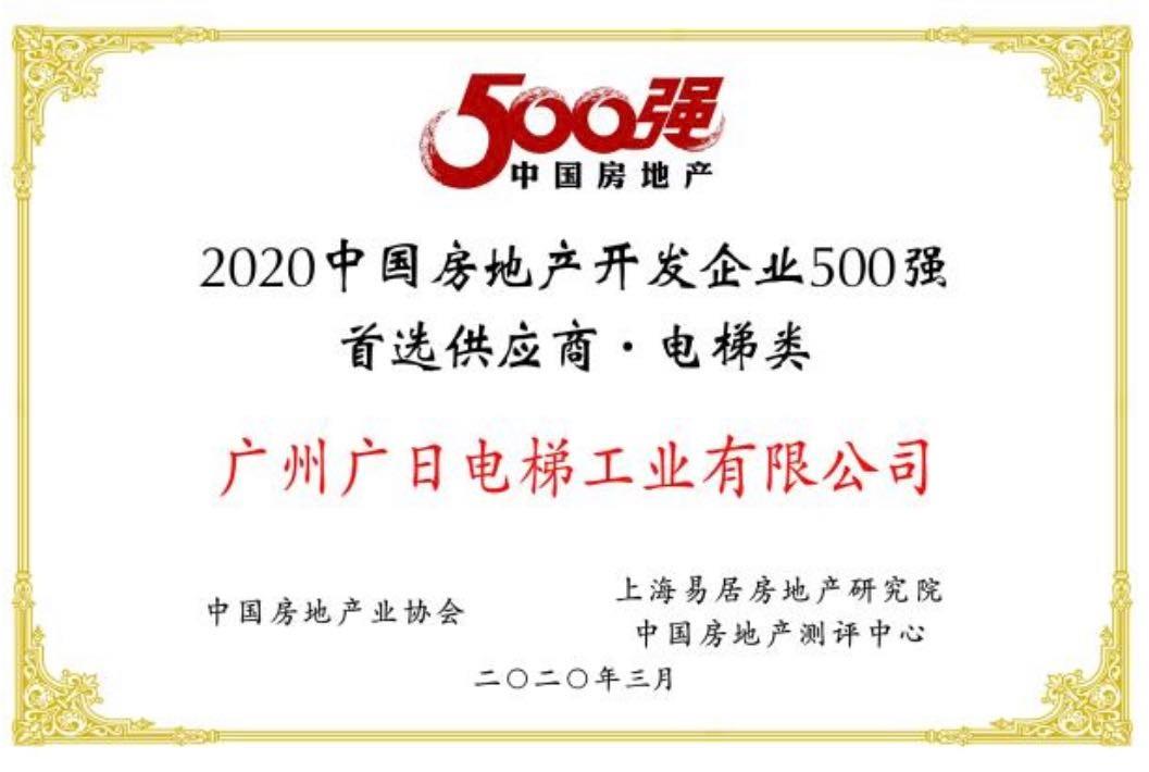 奖项名称: 广日电梯连续7年荣获“中国房地产开发企业500强首选供应商?电梯类”十强 颁发机构: 中国房地产业协会、上海易居房地产研究院中国房地产测评中心 2020年03月27日 奖项说明: 3月18日,中国房地产业协会、上海易居房地产研究院中国房地产测评中心首次通过在线形式发布了500强测评成果,广日电梯再次荣耀加身:连续7年荣获“中国房地产开发企业500强首选供应商·电梯类”十强,排名第6名,连续2年排名前移,且连续2年斩获民族电梯品牌第一!500强房开商首选供应商品牌测评研究报告,实践科学公正、客观权威的评价体系和方法,在房地产及上下游行业具有极高含金量的影响力和公信力。广日电梯秉承“广采众长,日就月将”的价值观,一直专注于城乡建设配套和民生工程服务,用辛勤的心力汗水浇灌出了辉煌的成果!