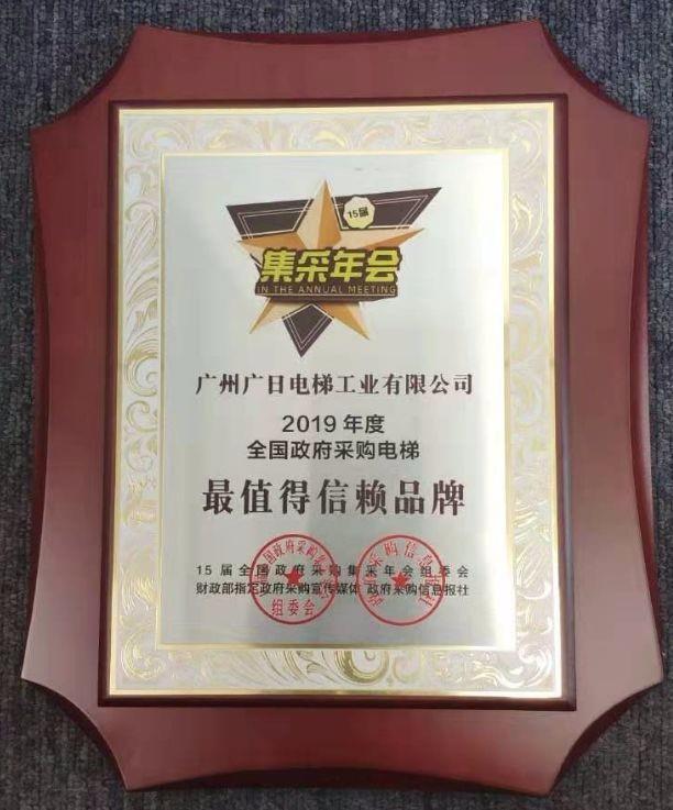 奖项名称: 广日电梯连续七年荣获政府采购奖项 颁发机构: 15届全国政府采购集采年会组委会、政府采购信息报社 2020年01月08日 奖项说明: 2020年1月8日,由财政部指定政府采购宣传媒体政府采购信息报联合政府采购信息网举办的15届全国政府采购集采年会在北京成功召开。本次大会上,广日电梯凭借着在政府采购领域多年的出色表现,荣获“2019年度全国政府采购电梯最值得信赖品牌”称号,这是广日电梯连续七年获此殊荣,同时首次获得“2019年度全国政府采购电梯服务十强供应商”奖项。