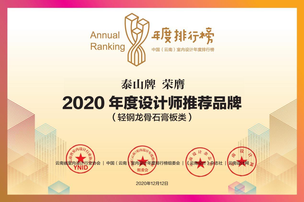 奖项名称: 2020年度设计师推荐品牌 颁发机构: 云南省室内设计行业协会 2020年12月12日 奖项说明: 泰山牌石膏板轻钢龙骨被认定为设计师推荐品牌