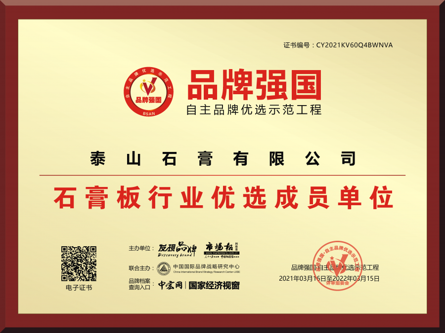 品牌强国自主品牌优选示范工程评选出泰山石膏有限公司为石膏板行业优选成员单位