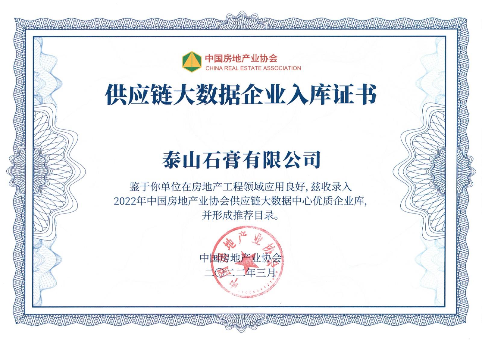 奖项名称: 供应链大数据企业入库证书 颁发机构: 中国房地产业协会 2022年03月01日 奖项说明: 鉴于泰山石膏有限公司在房地产工程领域应用良好,兹收录入2022年中国房地产业协会供应链大数据中心优质企业库,并形成推荐目录。