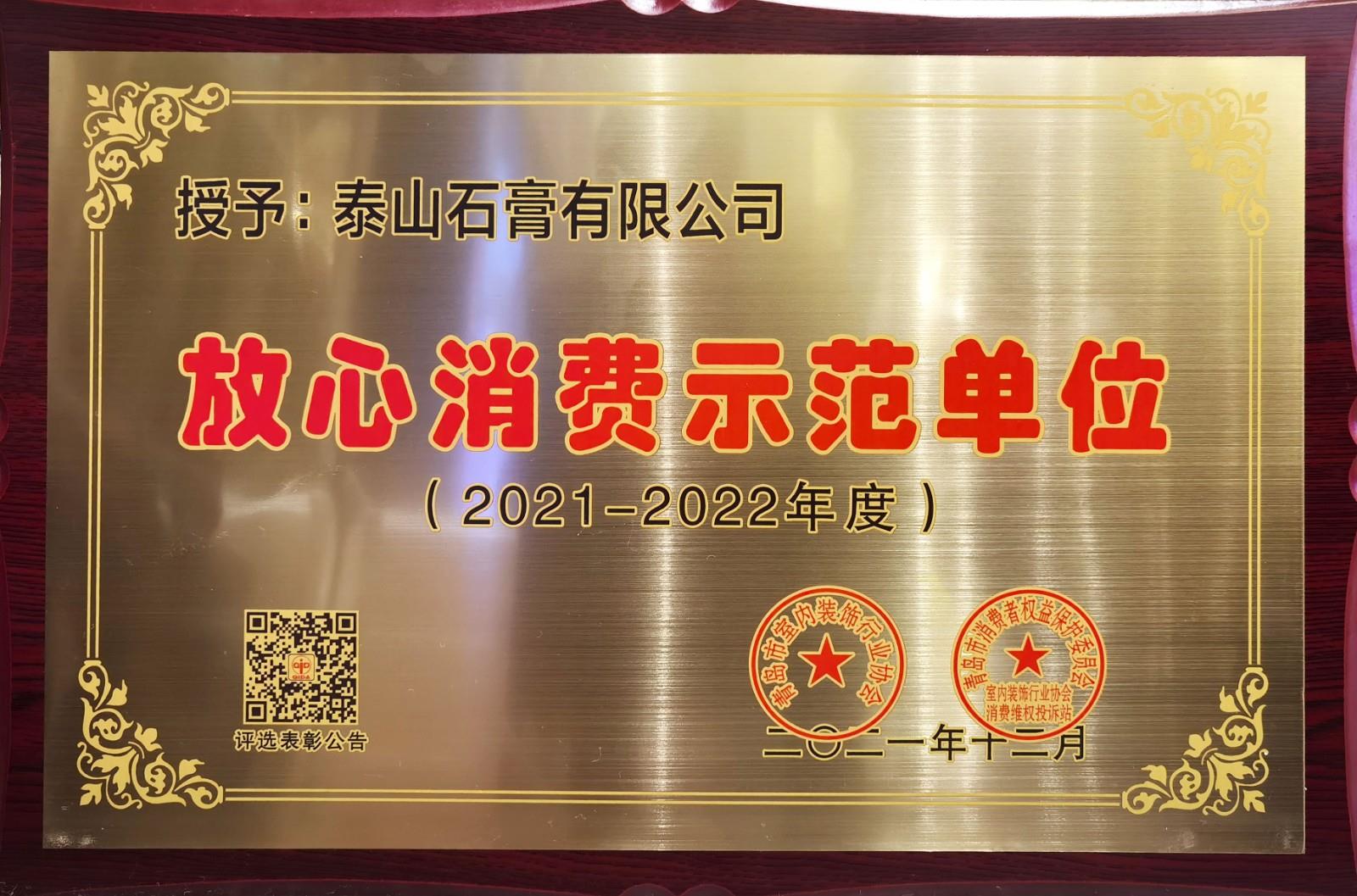 泰山石膏有限公司荣获由青岛室内装饰行业协会、青岛市消费者权益保护委员会联合颁发的放心消费示范单位荣誉称号。