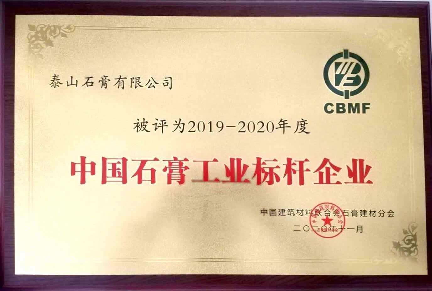 奖项名称: 2019-2020中国石膏工业标杆企业 颁发机构: 中国建筑材料联合分会石膏建材分会 2020年11月01日 奖项说明: 2019-2020中国石膏工业标杆企业