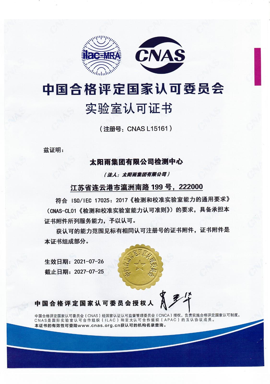 奖项名称: 太阳雨集团有限公司-CNAS实验室认可证书(中文) 颁发机构: 中国合格评定国家认可委员会 2021年07月26日 奖项说明: