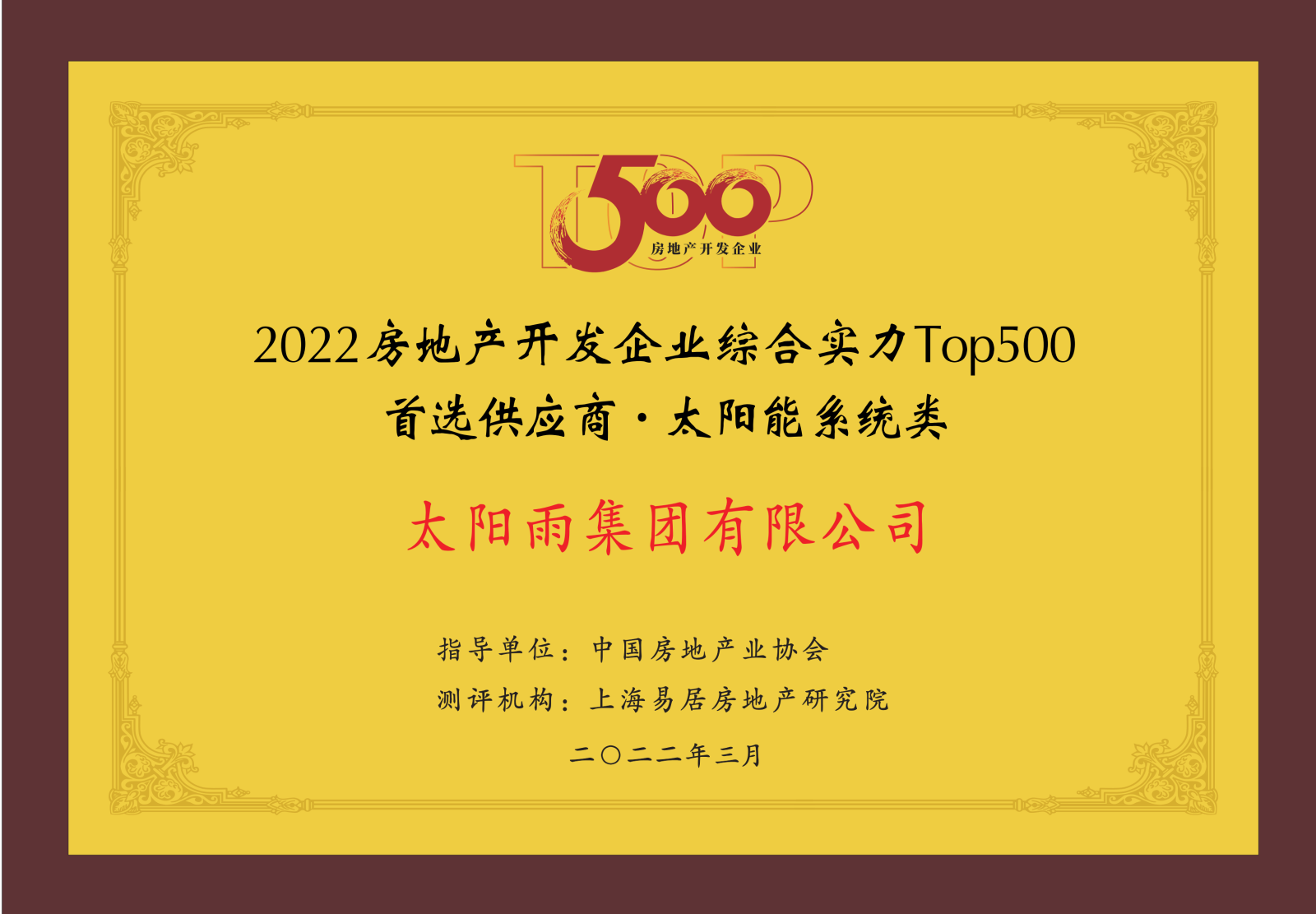 奖项名称: 中国房地产开发企业500强首选供应商-太阳能系统类2022 颁发机构: 中国房地产业协会、上海易居房地产研究院 2022年03月01日 奖项说明: