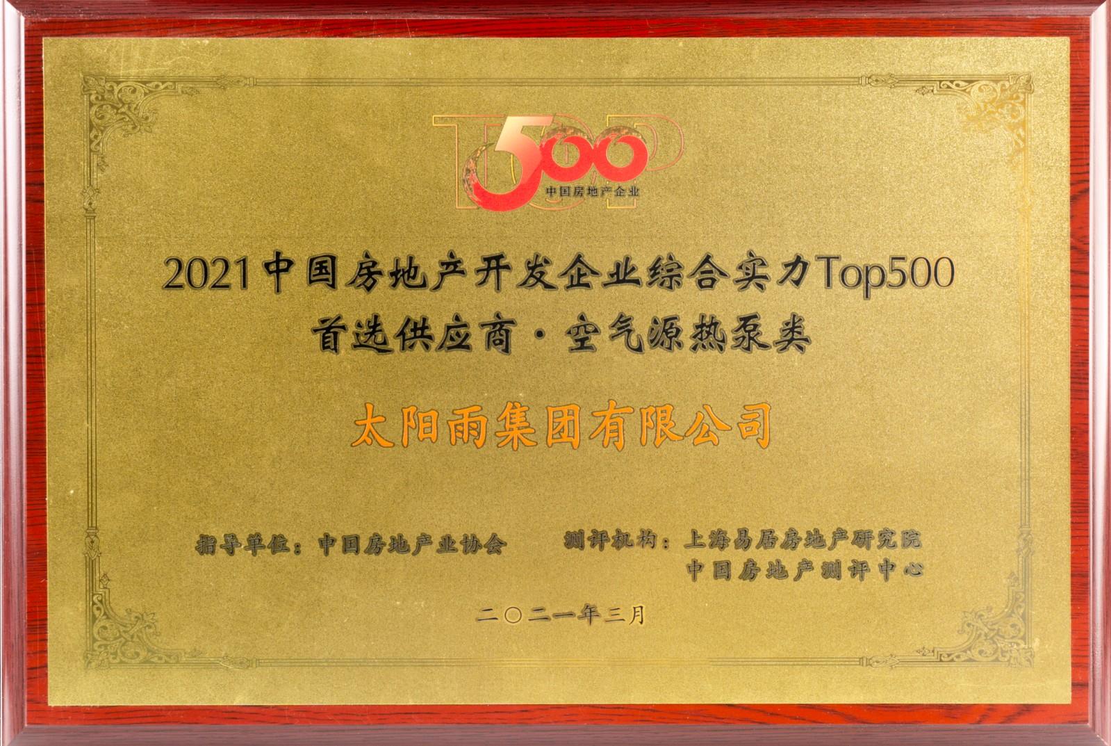 奖项名称: 中国房地产开发企业综合实力TOP500首选供应商品牌--空气源热泵类 颁发机构: 上海易居房地产研究中心、中国房地产测评中心 2021年03月10日 奖项说明: 中国房地产开发企业综合实力TOP500首选供应商品牌空气源热泵类