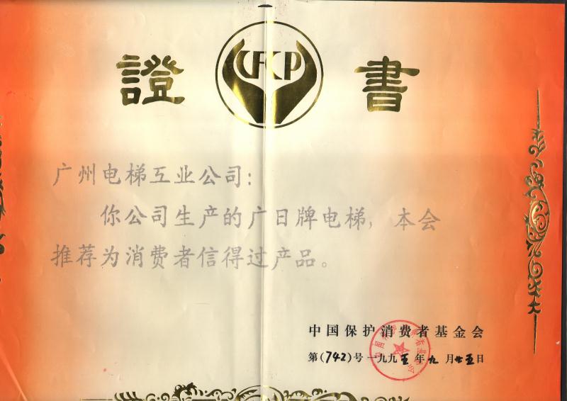 奖项名称: 1995年广日牌电梯被推荐为消费者信得过产品