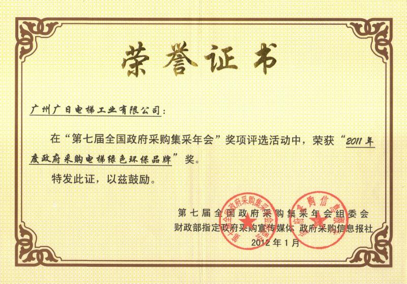 奖项名称: 2011年度政府采购电梯绿色环保品牌
