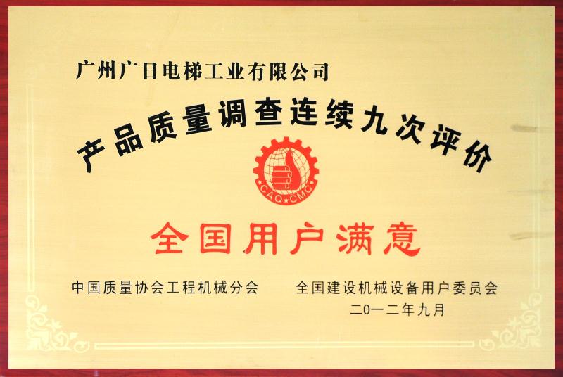 奖项名称: 2012年生产的客梯、货梯被评为全国用户满意产品