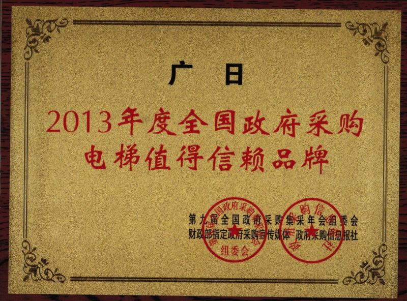 奖项名称: 2013年度全国政府采购电梯值得信赖品牌