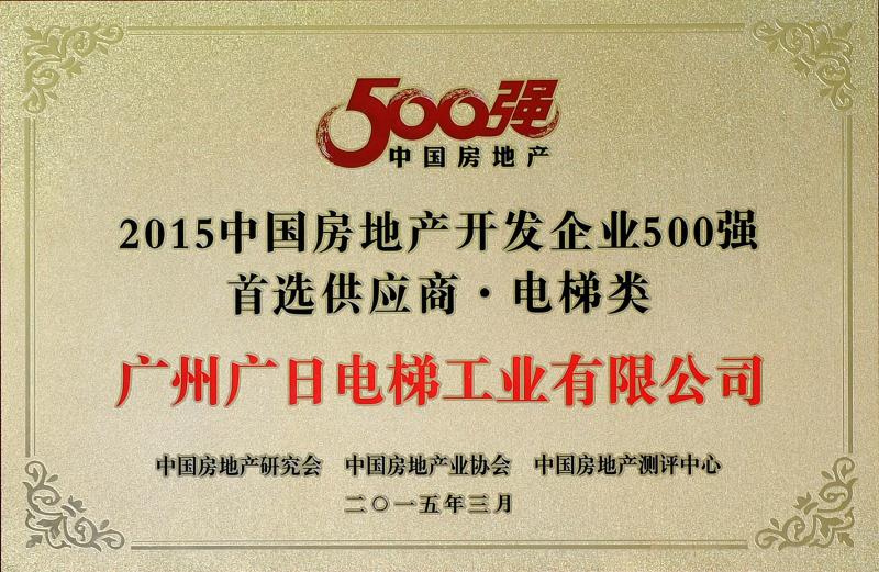 奖项名称: 2015年中国房地产开发企业500强首选供应商(电梯类)