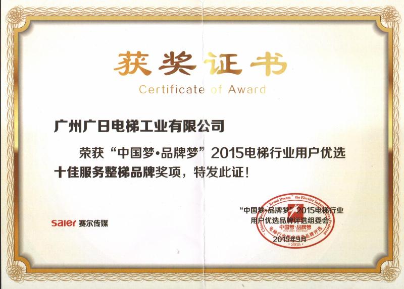 奖项名称: 2015电梯行业用户优选十佳服务整梯品牌