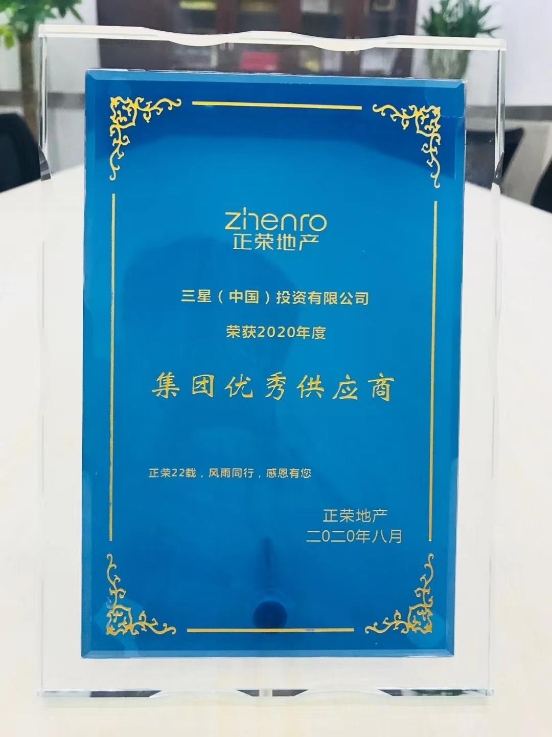 奖项名称: 正荣地产集团优秀供应商 颁发机构: 正荣地产 2020年08月01日 奖项说明: 三星( 中国 ) 投资有限公司
