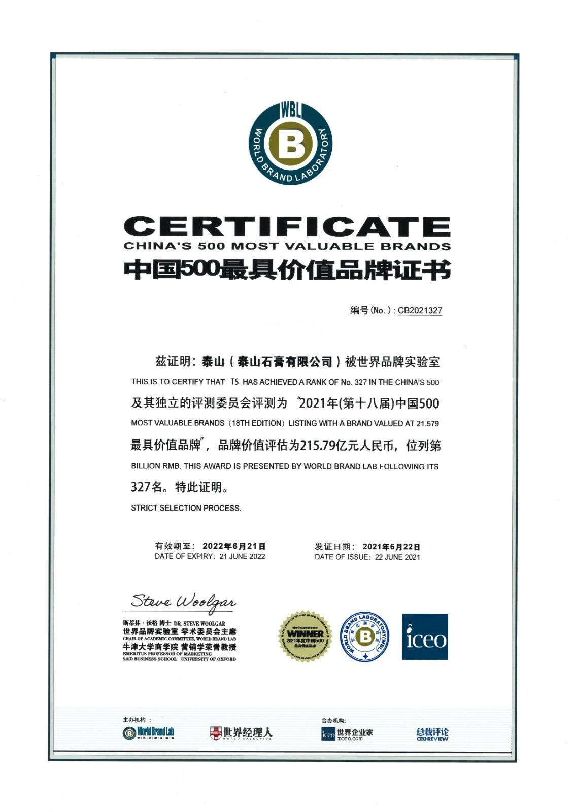 奖项名称: 中国500最具价值品牌证书 颁发机构: 世界品牌实验室 学术委员会主席 2021年06月22日 奖项说明: 中国500最具价值品牌证书