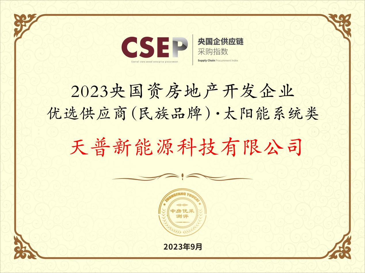 奖项名称: 2023央国资房地产开发企业优选供应商(民族品牌)·太阳能系统类 颁发机构: 中房优采测评 2023年09月01日 奖项说明: 天普凭借经营数据、工程业绩、供应水平、绿色产品、用户评价、专利技术、品牌影响力7大指标突出优势,以15%的样本优选率,获得该奖项。
