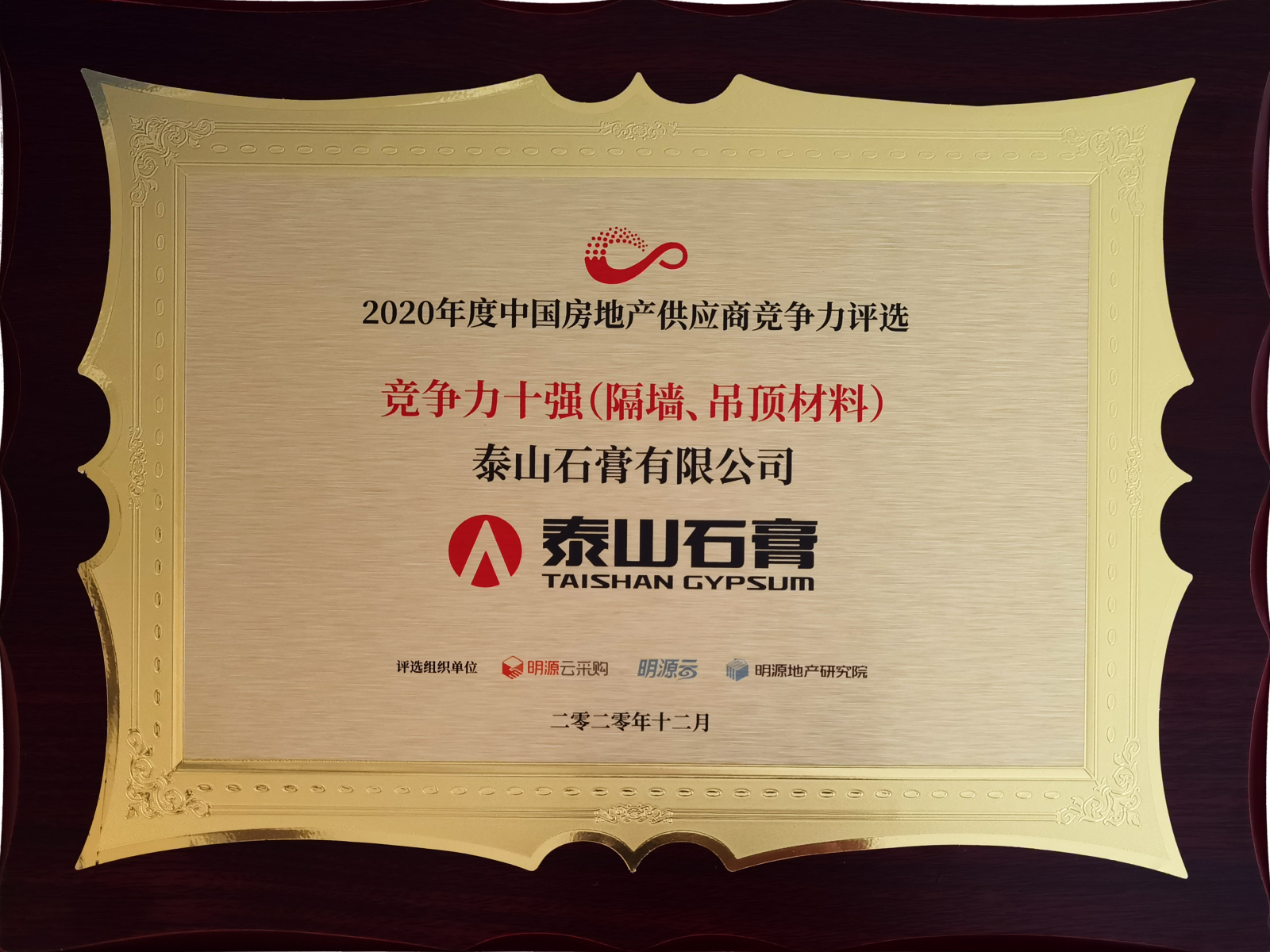 奖项名称: 2020年度中国房地产供应链竞争力评选竞争力十强 颁发机构: 明源云采购、明源云、明源地产研究院 2020年12月26日 奖项说明: 2020年度中国房地产供应链竞争力评选竞争力十强(隔墙、吊顶材料)