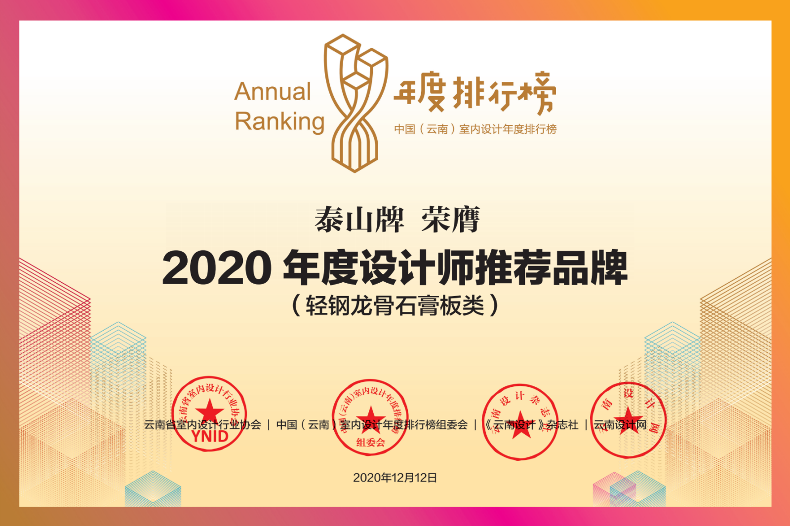 奖项名称: 云南 设计师推荐品牌 颁发机构: 云南省室内设计行业协会、中国(云南)室内设计年度排行榜组委会、《云南设计》杂志社、云南设计网 2020年12月12日 奖项说明: