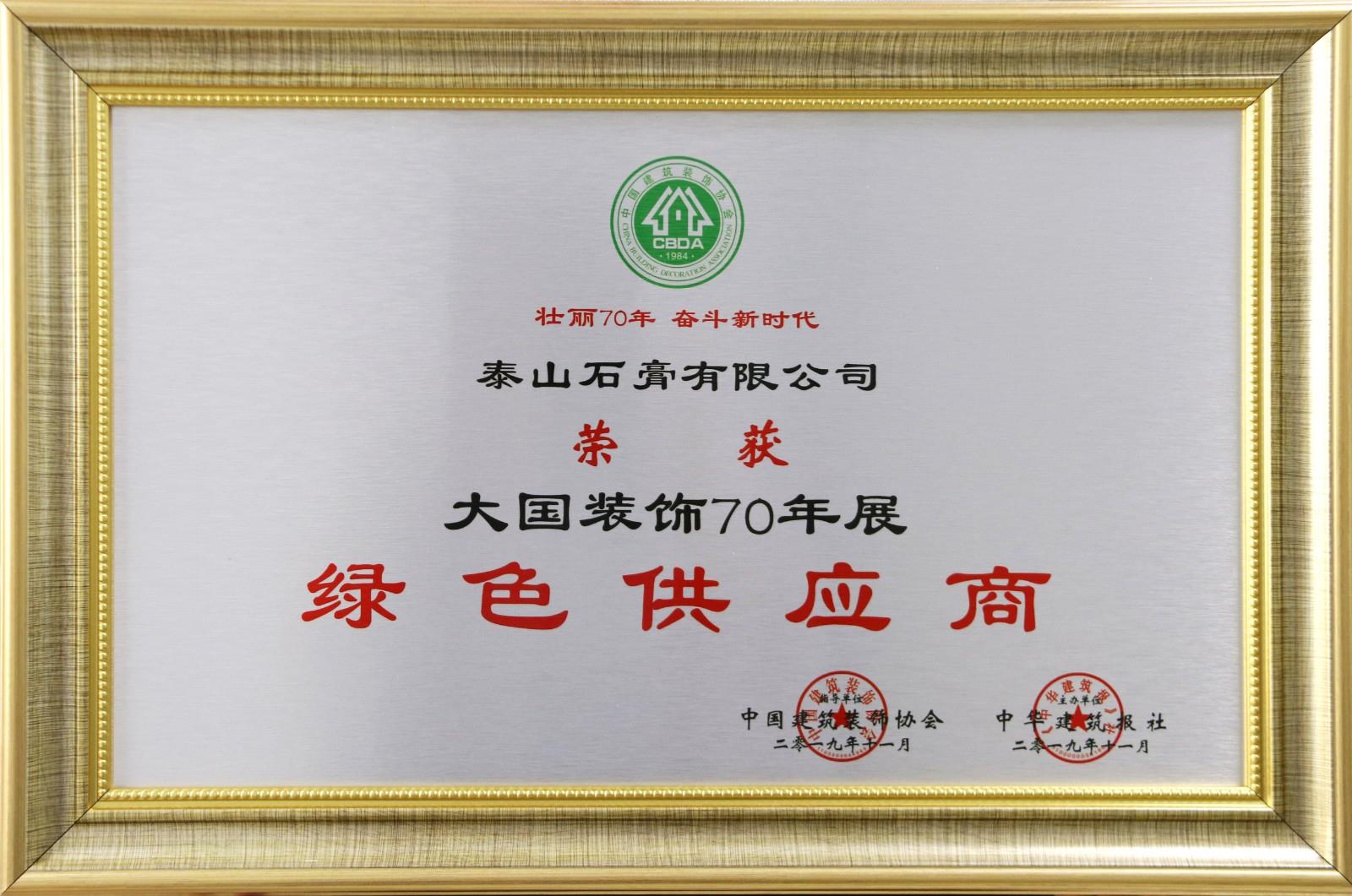 奖项名称: 大国装饰70年展绿色供应商 颁发机构: 中国建筑装饰协会、中华建筑报社 2019年11月16日 奖项说明: 中国建筑装饰协会、中华建筑报社授予大国装饰70年展绿色供应商