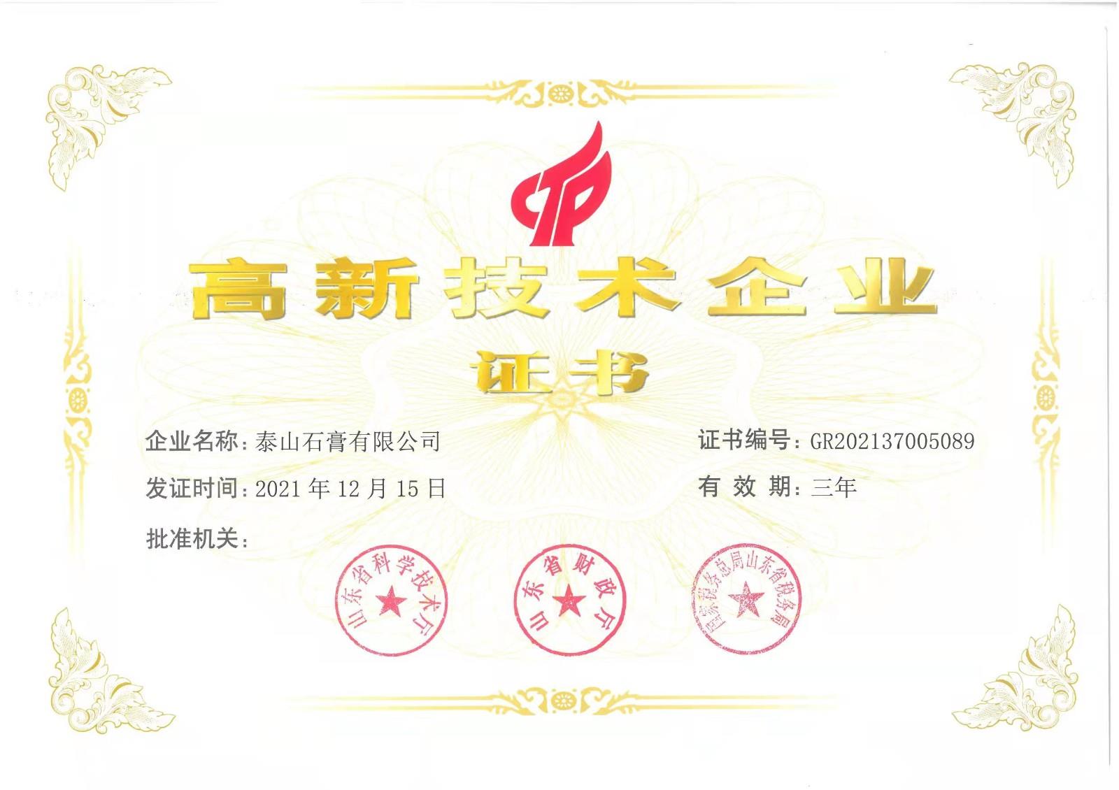 | 奖项名称: | 高新技术企业证书 |