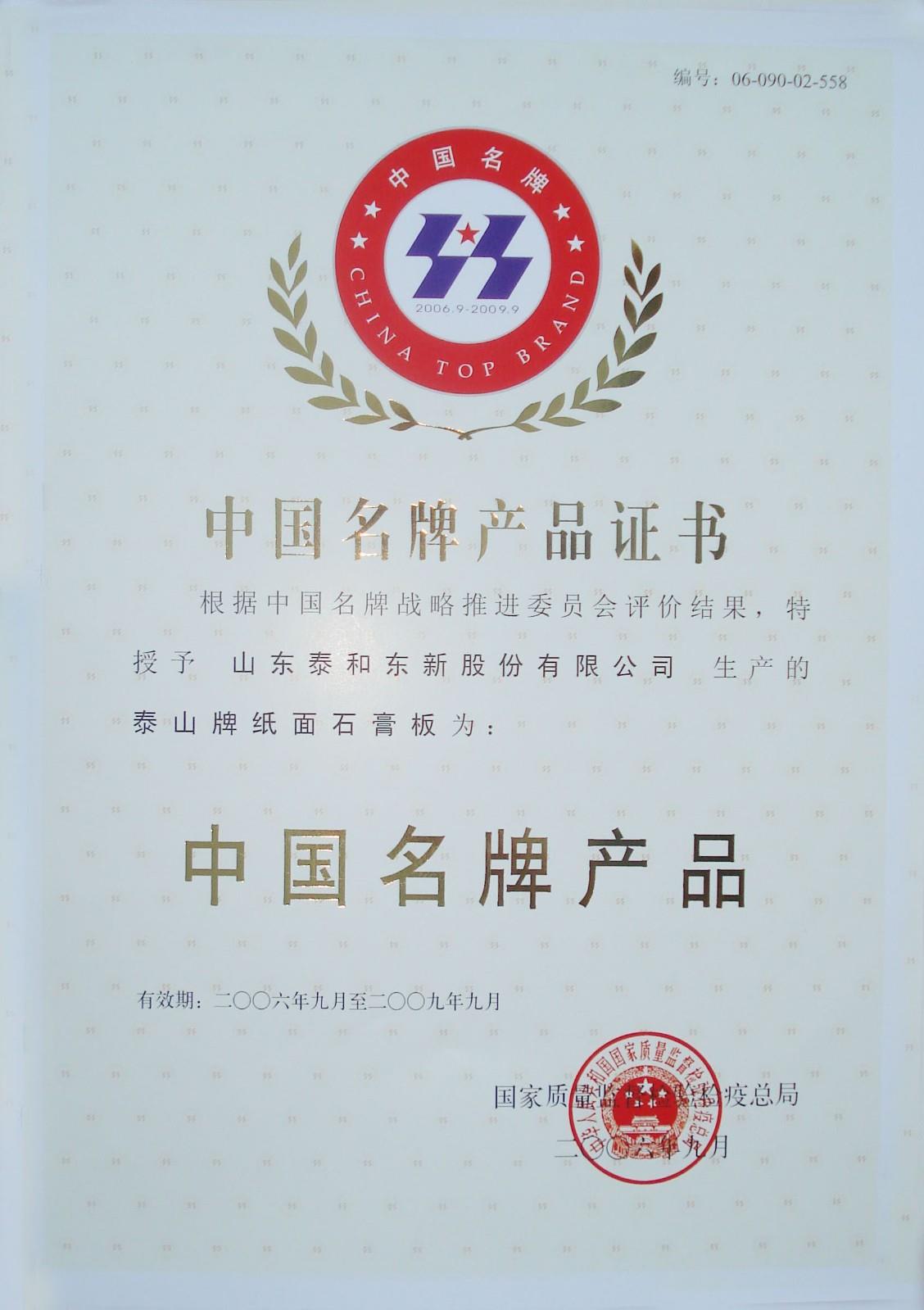 奖项名称: 中国名牌产品 颁发机构: 国家质量监督检验检疫总局 2006年09月14日 奖项说明: 国家质量监督检验检疫总局授予中国名牌产品