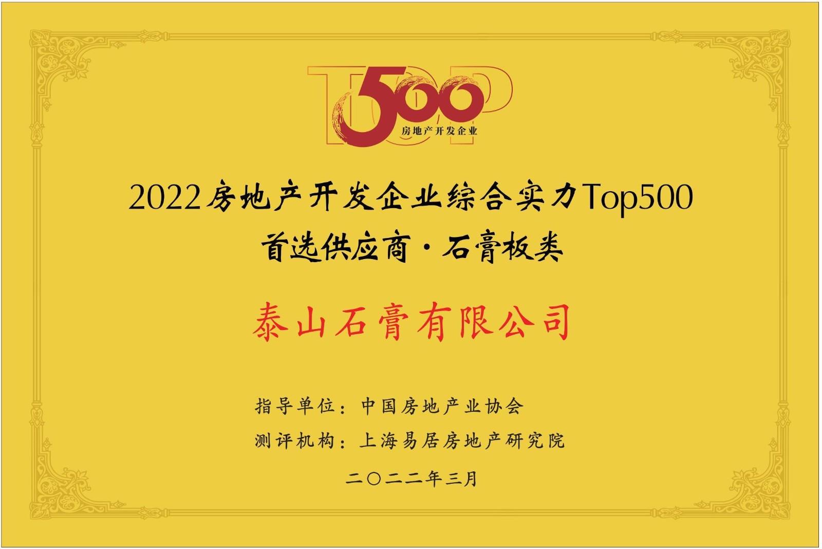 中国房地产业协会、上海易居房地产研究院、中国房地产测评中心授予2022中国房地产开发企业综合实力Top500首选供应商.石膏板类