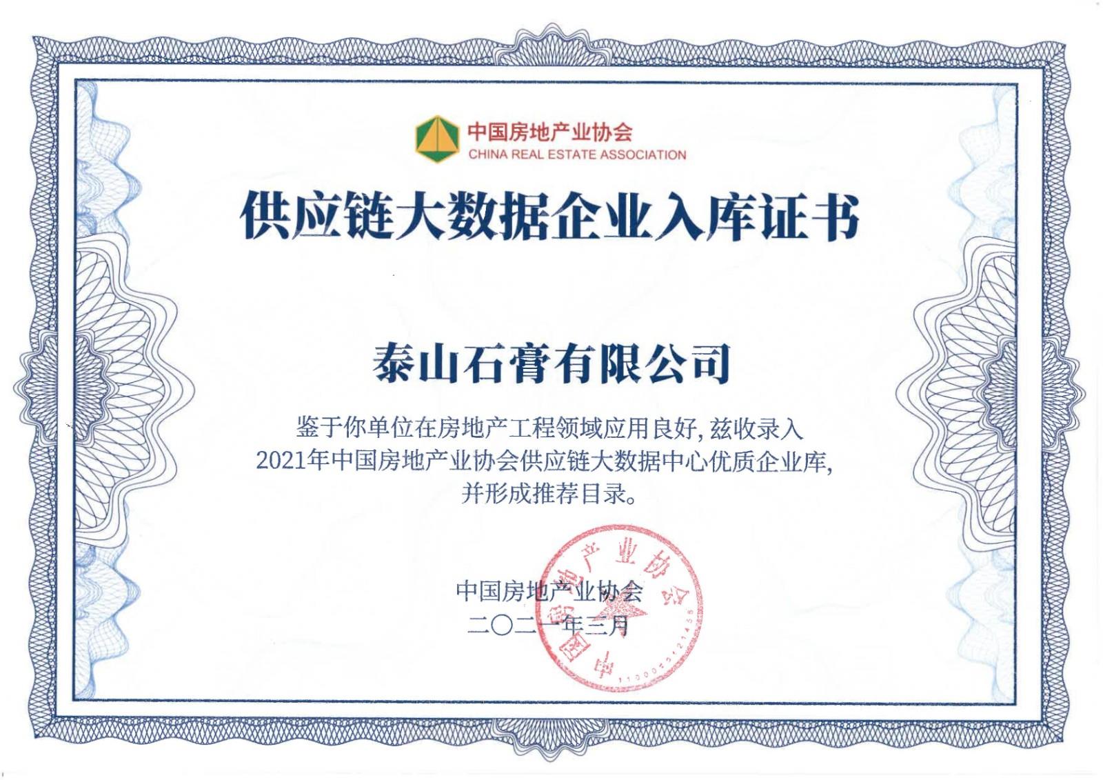 奖项名称: 供应链大数据企业入库证书 颁发机构: 中国房地产业协会 2022年03月18日 奖项说明: 中国房地产业协会授予供应链大数据企业入库证书