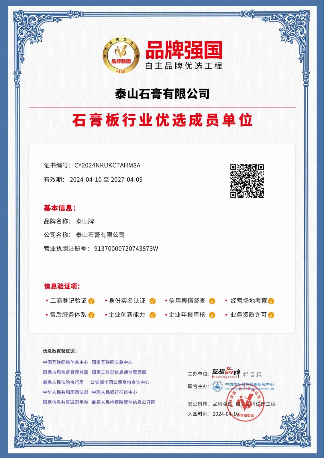 奖项名称: 石膏板行业优选成员单位 颁发机构: 品牌强国自主品牌优选工程 2024年04月10日 奖项说明: 石膏板行业优选成员单位