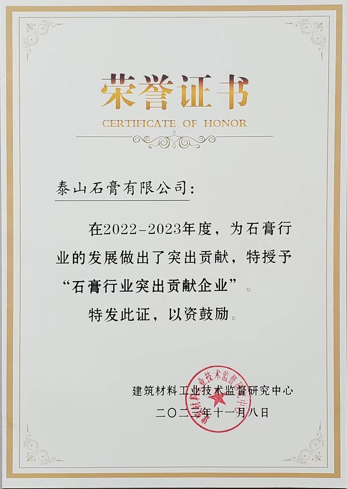 奖项名称: 石膏行业突出贡献企业 颁发机构: 建筑材料工业技术监督研究中心 2023年11月08日 奖项说明: 石膏行业突出贡献企业