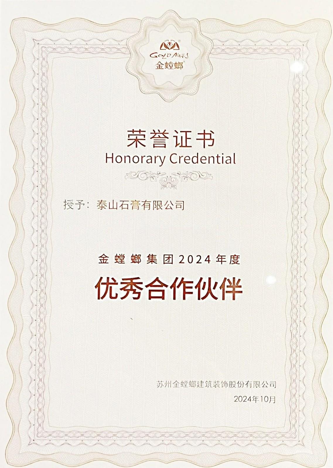 奖项名称: 金螳螂集团2024年度优秀合作伙伴 颁发机构: 苏州金螳螂建筑装饰股份有限公司 2024年10月01日 奖项说明: 金螳螂集团2024年度优秀合作伙伴