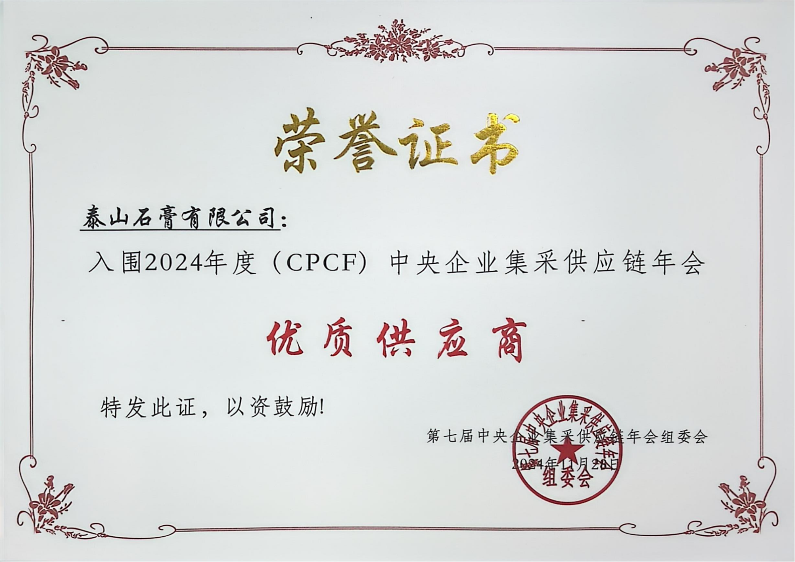奖项名称: 2024年度(CPCF)中央企业集采供应链年会优质供应商 颁发机构: 第七届中央企业集采供应链年会组委会 2024年11月28日 奖项说明: