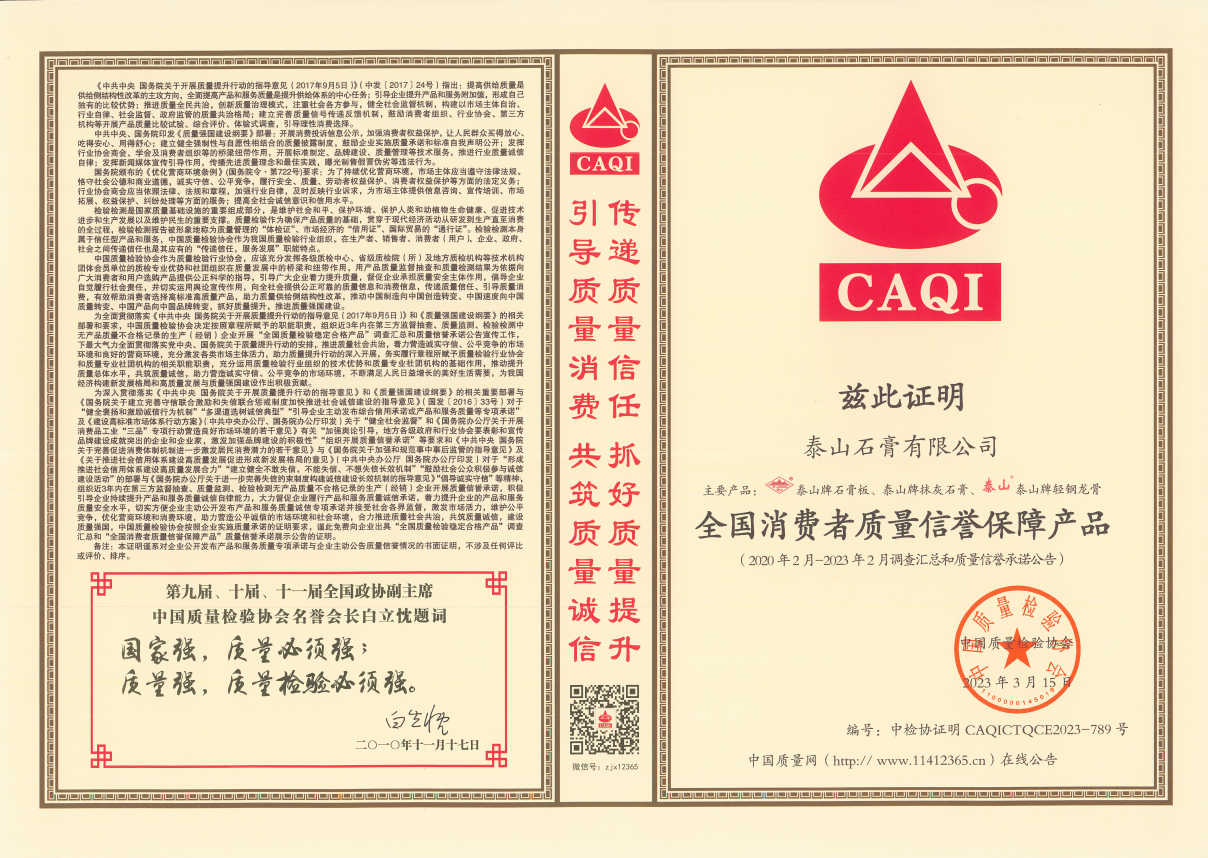 奖项名称: 全国质量检验信誉保障产品、全国消费者质量信誉保障产品 颁发机构: 中国质量检验协会 2023年03月15日 奖项说明: