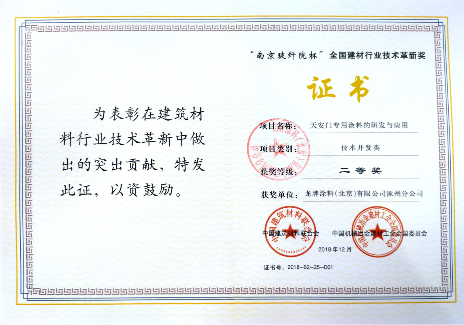 奖项名称: “南京玻纤院杯” 颁发机构: 中国机械冶金建材工会全国委员会 2018年12月12日 奖项说明: “南京玻纤院杯”全国建材行业技术革新奖