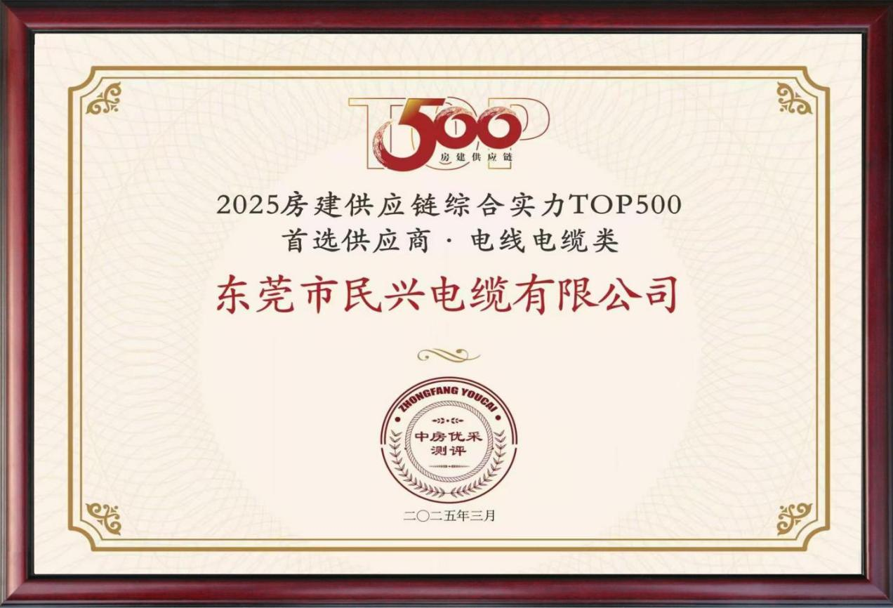 奖项名称: 2025房建供应链综合实力TOP500首选供应商 电线电缆类