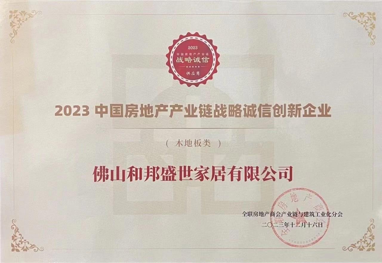 奖项名称: 2023 中国房地产产业链战略诚信创新企业 颁发机构: 全联房地产商会产业链与建筑工业化分会 2023年12月16日 奖项说明: 2023 中国房地产产业链战略诚信创新企业