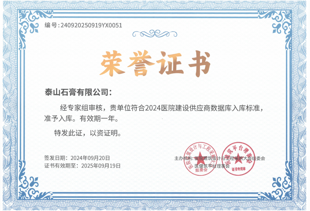 | 奖项名称: | 2024医院建设供应商数据库入库证书 |
