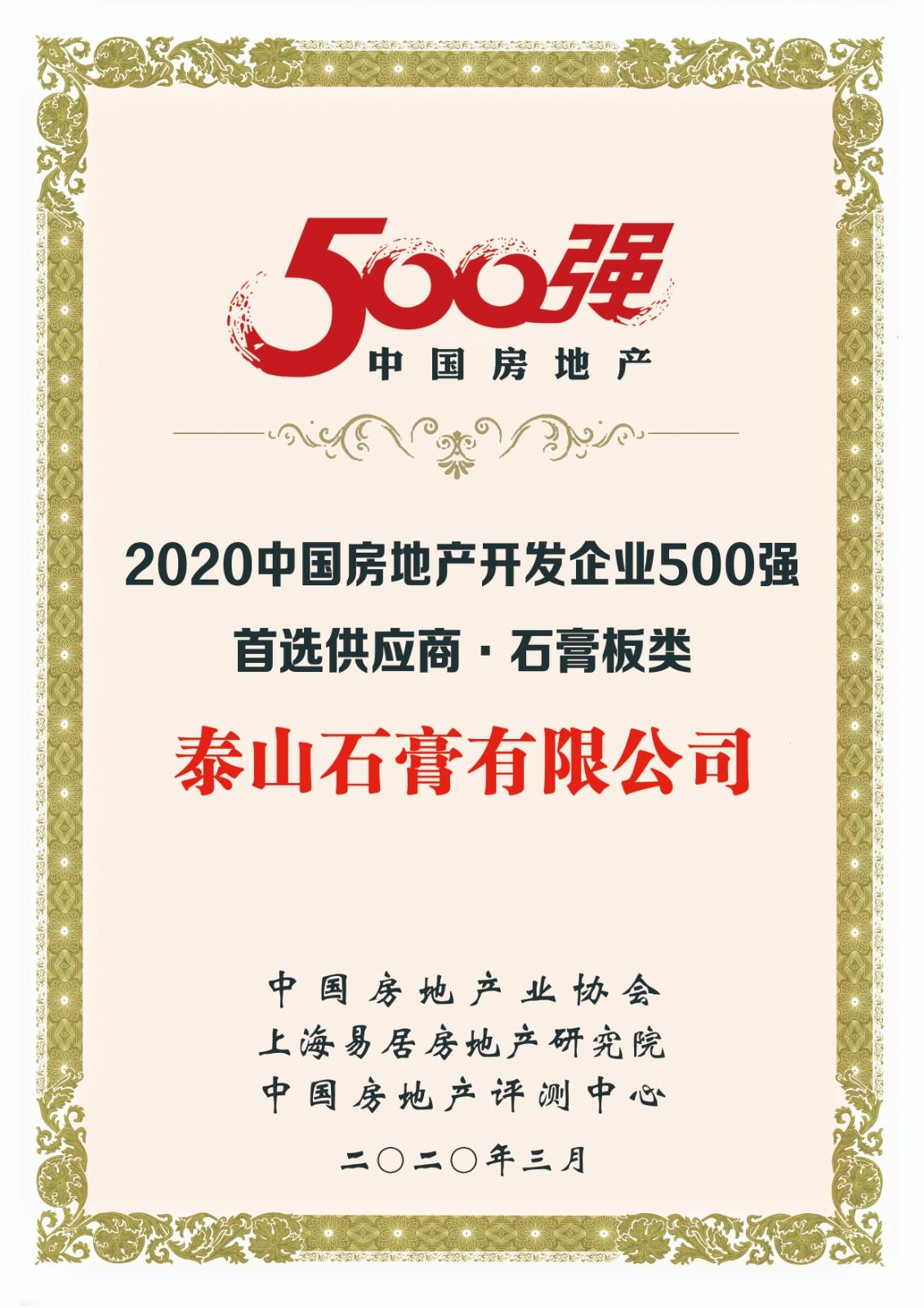 奖项名称: 中国房地产开发企业500强首选供应商-石膏板类 颁发机构: 中国房地产业协会、上海易居房地产研究院、中国房地产评测中心 2020年03月01日 奖项说明: 中国房地产开发企业500强首选供应商-石膏板类