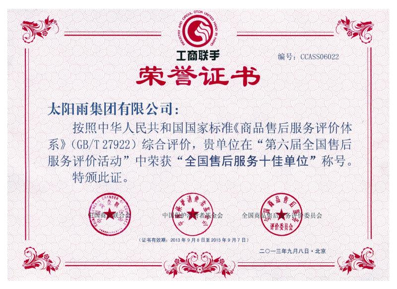 奖项名称: 第六届全国售后服务十佳单位 颁发机构: 中国商业联合会、中国保护消费者基金会、全国商品售后服务评价委员会 2013年09月08日 奖项说明: 第六届全国售后服务十佳单位