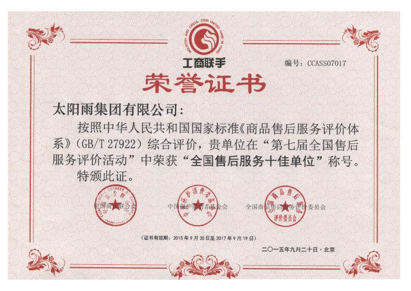 奖项名称: 第七届全国售后服务十佳单位 颁发机构: 中国商业联合会、中国保护消费者基金会、全国商品售后服务评价委员会 2015年09月08日 奖项说明: 第七届全国售后服务十佳单位