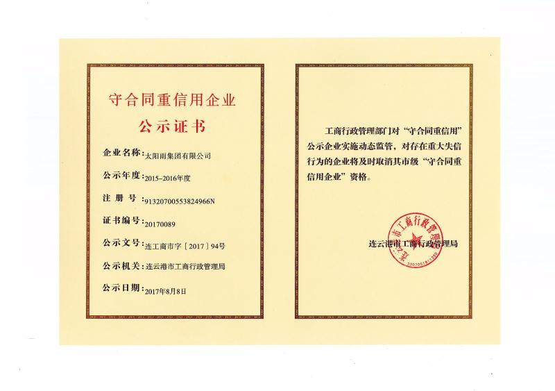 奖项名称: 2015-2016年度守合同重信用企业证书 颁发机构: 连云港市工商行政管理局 2017年08月08日 奖项说明: 2015-2016年度守合同重信用企业证书