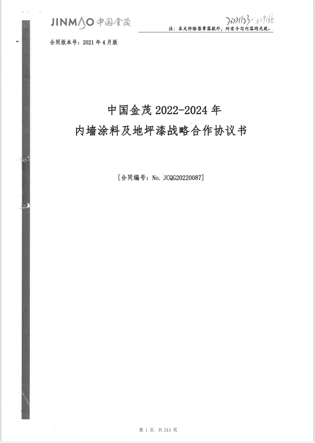 开发商名称: 中****股集团有限公司 战略合作名称: 中****022-2024年内墙涂料及地坪漆战略合作协议书 战略合作类别: 涂料 战略合作期限: 2022年11月30日至2024年11月29日 战略合作范围: 中国金茂2022-2024年全国 ...... [登录可见]