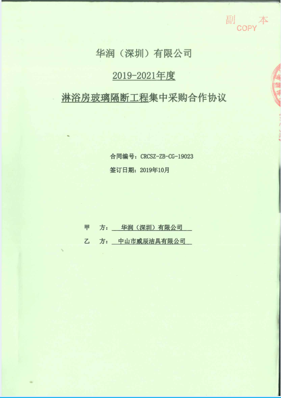开发商名称: 华****限公司 战略合作名称: 2****2021年度淋浴房玻璃隔断工程集中采购合作协议 战略合作类别: 淋浴屏 战略合作期限: 2019年12月01日至2021年12月01日 战略合作范围: 华润(深圳)有限公司(华南区域)2019-2 ...... [登录可见]